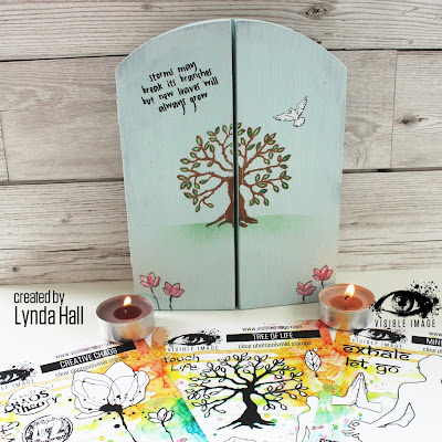 While the paint was drying I created a scene with distress ink. I stamped the main image from the set Mindful Moments set onto a mop up piece of card with oxide inks on and fussy cut it out. I framed her by stamping branches from the tree in the Tree of Life set around the top and colouring in the leaves. The doves are from the Guardian Angel set. I just love how all Visible Image stamps are so versatile and you can mix and match sets for maximum creative options.