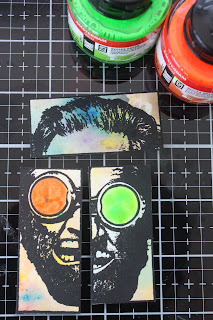 I stamped the main image onto a mop up piece of card and used Amsterdam acrylic ink to paint the glasses. When that was dry I used a mask to stamp on top of them.